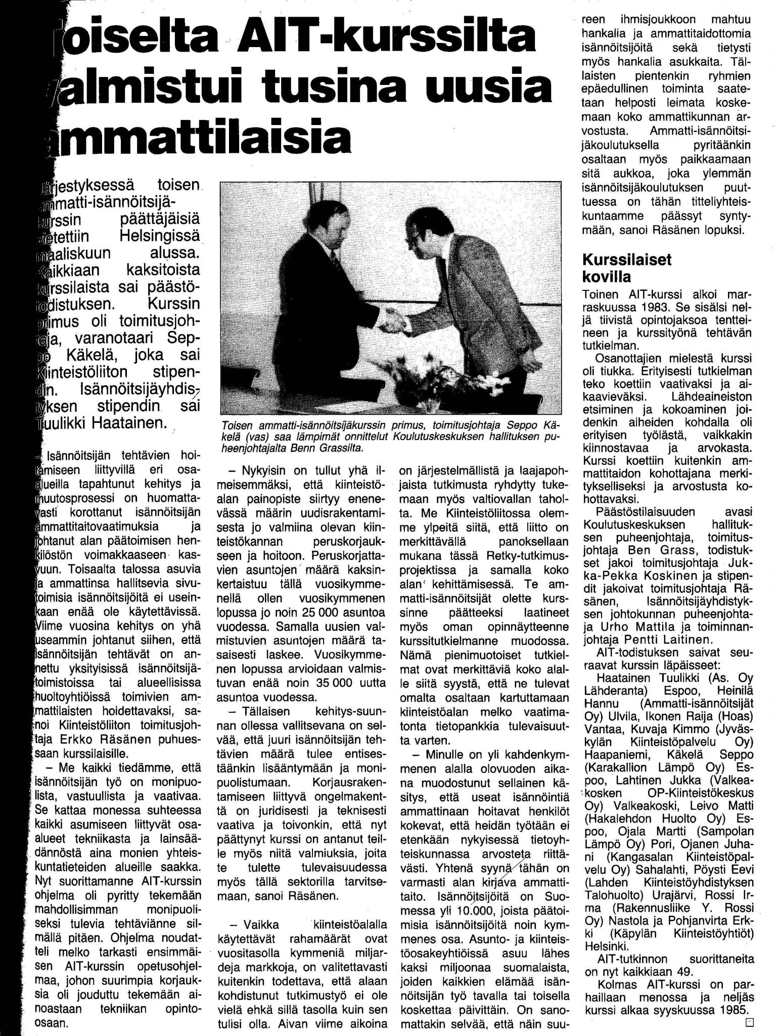 Suomen Kiinteistölehden joulukalenteri julkaisee vanhoja juttuja lehden 92-vuotisen historian varrelta. Luukusta 15 löytyy juttu vuodelta 1985. Siinä kerrotaan toisen AIT-kurssin valmistumisesta. Juuri päätökseen saatiin Kiinkon 56. AIT® -kurssi.