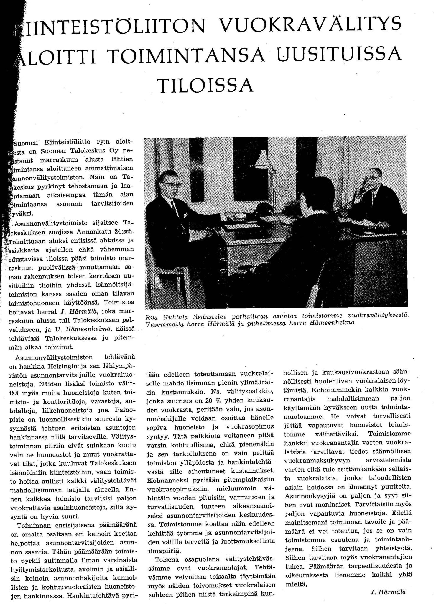 Suomen Kiinteistölehden joulukalenteri julkaisee vanhoja juttuja lehden 92-vuotisen historian varrelta. Luukusta 3 löytyy juttu vuodelta 1965. Siinä kerrotaan Kiinteistöliiton vuokravälitystoiminnasta, jota hoiti Suomen Talokeskus Oy. Sisaryrityksemme historiaan liittyykin monenlaista toimintaa. Suomen Talokeskus on myös aikoinaan toiminut Suomen Kiinteistölehden kustantajana useaan otteeseen lehden historian aikana.