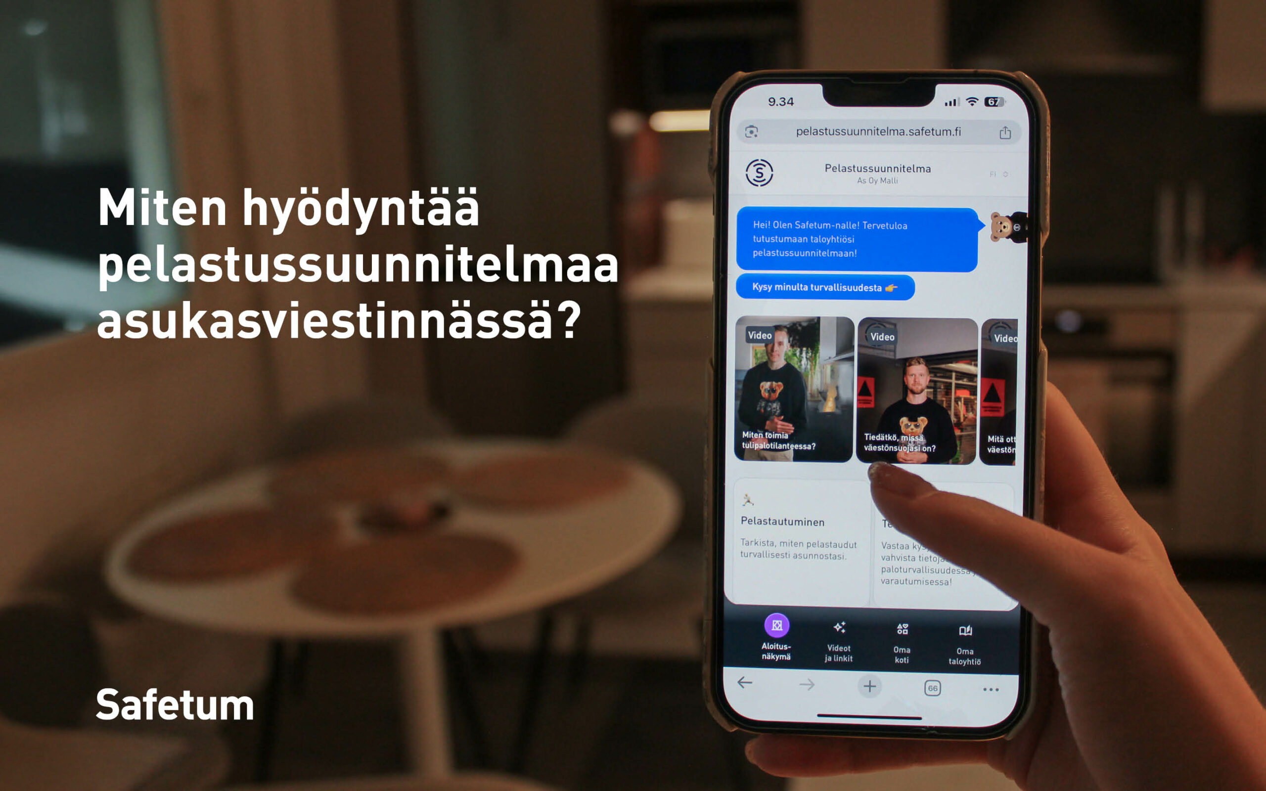 Safetumin Pelastussuunnitelma-palveluun päivittyvät myös ajankohtaiset turvallisuusvinkit videoiden ja ohjeiden muodossa. Näin asukkaalla on aina näkyvillä ajankohtaisimmat ohjeistukset esimerkiksi syksyn sähkökatkoihin ja joulun paloturvallisuuteen.